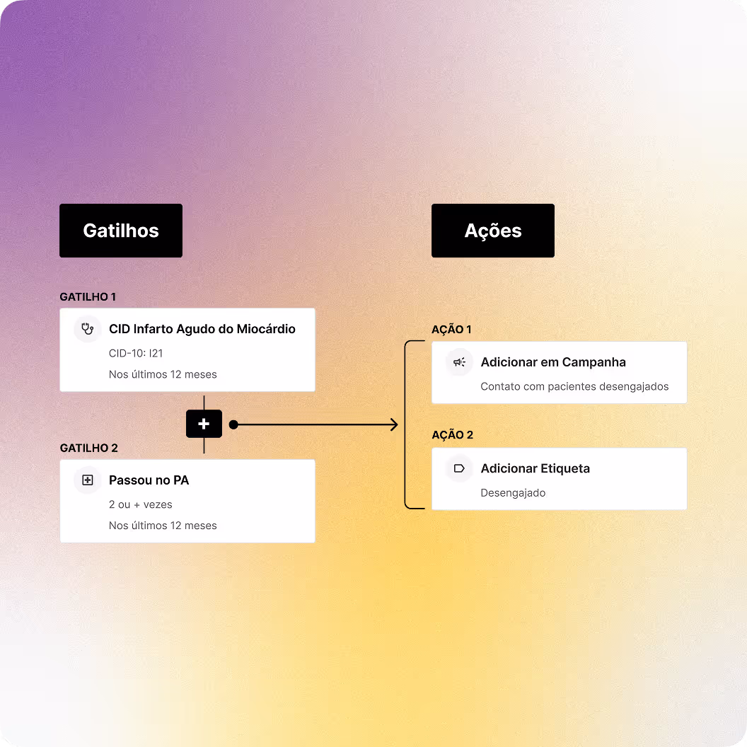 Sua operação traduzida em regras automatizadas. Elimine tarefas manuais, como incluir pacientes em linhas de cuidado a partir de CIDs ou atualizar status de acompanhamento, tudo feito a partir de dados integrados. Para deixar ainda mais simples, nosso time te ajuda a criar e acompanhar seus fluxos ideais.